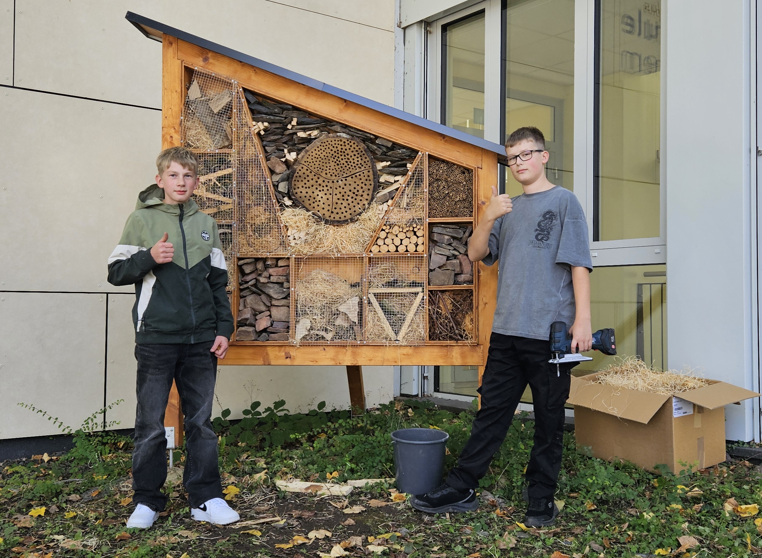 Ein ganz besonderer Dank gilt unseren engagierten Mitgliedern der Technik-AG: Leon, Derrick und Noél haben das Insektenhotel mit viel Eigeninitiative und handwerklichem Geschick gebaut und bestückt. Ihr habt wirklich tolle Arbeit geleistet – darauf könnt ihr stolz sein!