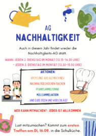 In der Nachhaltigkeits-AG dreht sich alles darum, ein Bewusstsein für Nachhaltigkeit in der Schule und zuhause zu schaffen. Mit unserer Pfandtonne vereinbaren wir Nachhaltigkeit mit Spenden für einen guten Zweck. So konnten wir in den vergangenen Schuljahren bereits das Kinderhospitz Koblenz und das Tierheim Mayen unterstützen.
