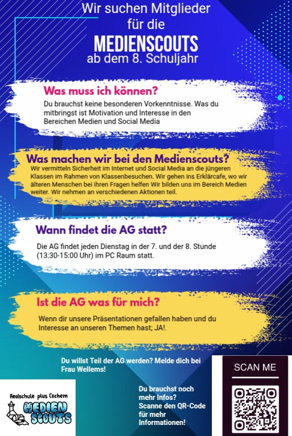 So konnten in den letzten Jahren schon mehrere tausend Schülerinnen und Schüler von den engagierten Medienscouts im Umgang mit digitalen Medien angeleitet und unterstützt werden. Eine AG also, die aus dem Alltag der RS plus Cochem nicht mehr wegzudenken ist!